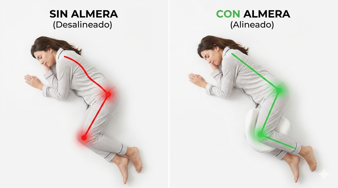 Alineación total: Mantiene la columna, cadera y rodillas en su posición natural al dormir de lado.